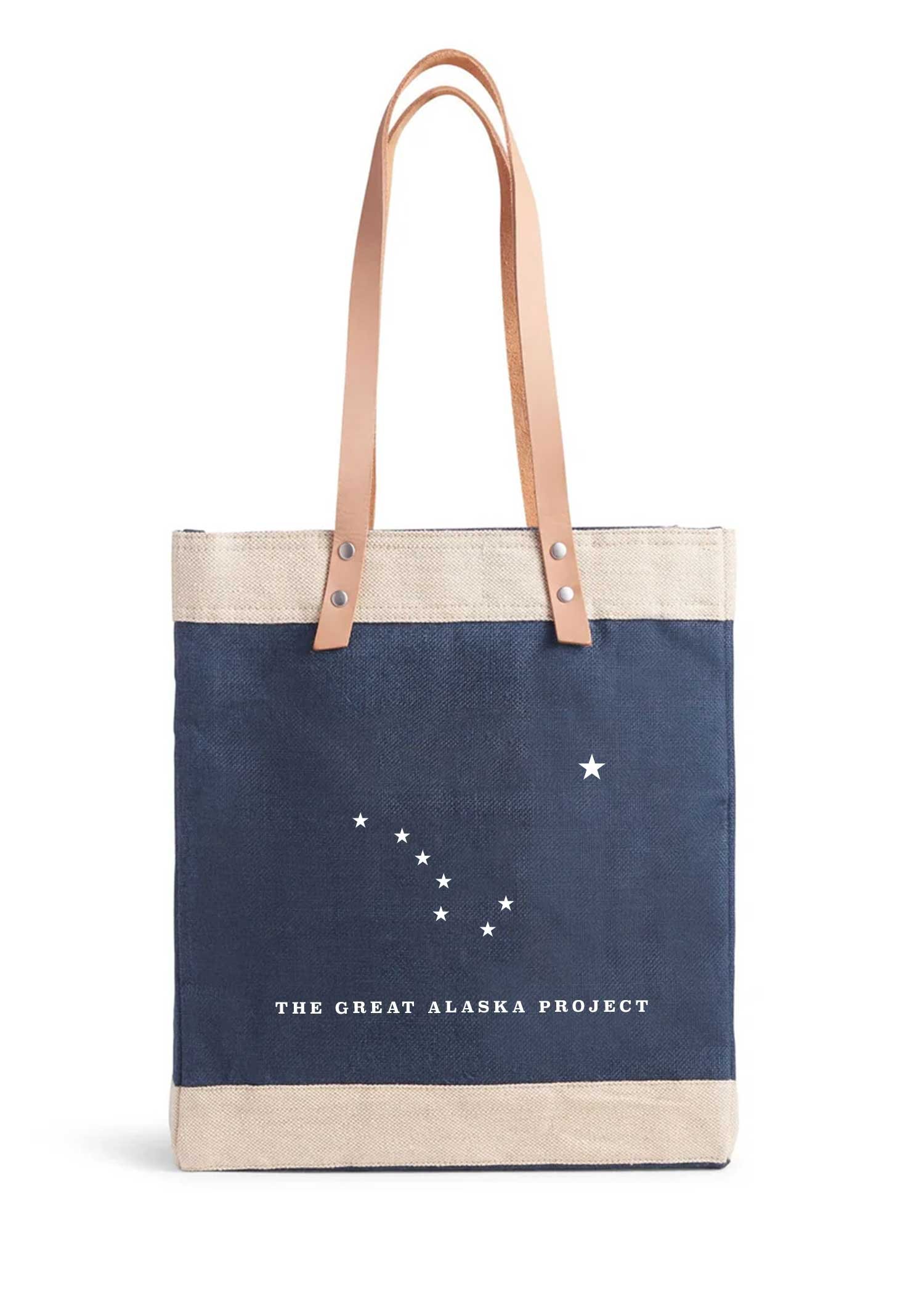 Supporters receive an Apolis x Joshua Tree Studio market bag*. Ethically made in Bangladesh by a factory supporting working women. The navy hemp bag features leather strap handles & an embroidered Big Dipper pointing to the North Star, the state symbol of Alaska.